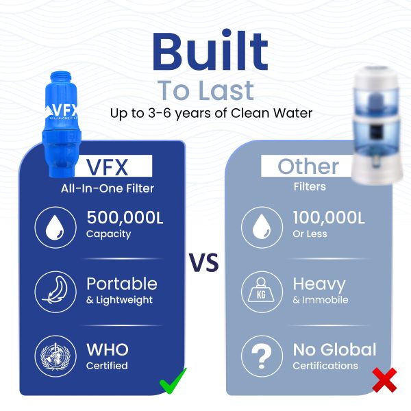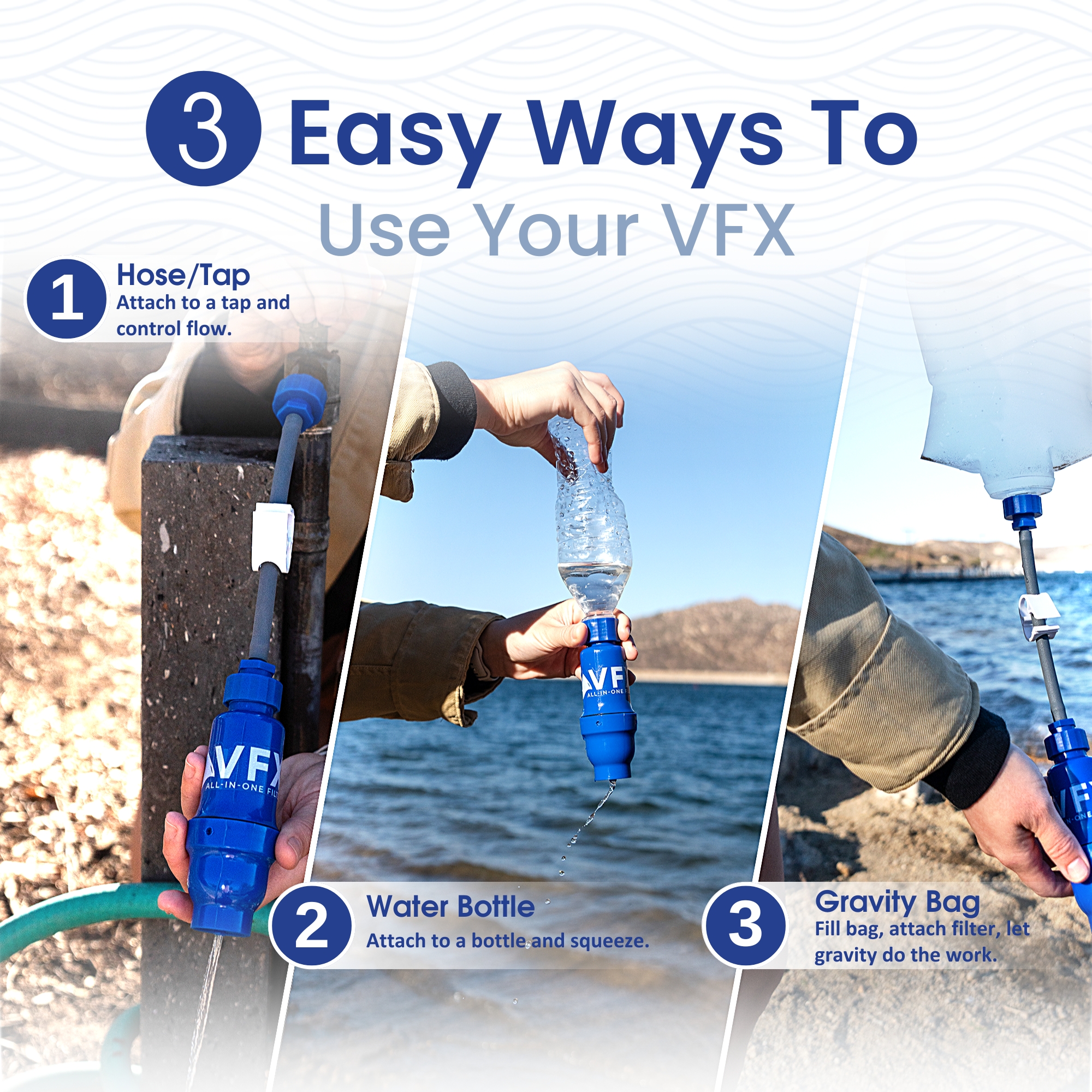 The VFX All-in-One is trusted by adventurers, homeowners, and humanitarian organizations worldwide. Investing in this portable water filter means having peace of mind, knowing that safe drinking water is always within reach—without relying on expensive bottled water or unstable municipal supply.