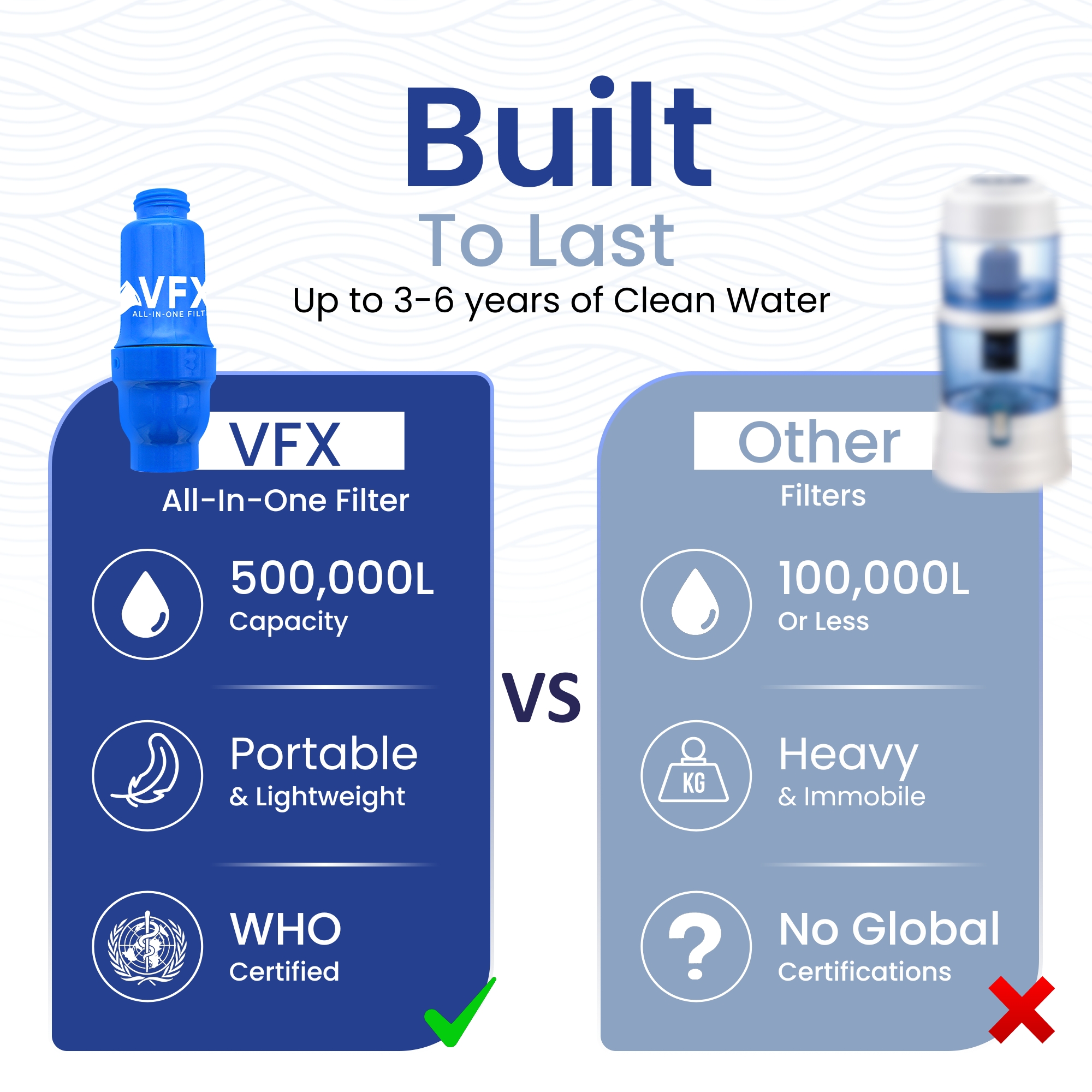 Access to clean water is not always guaranteed, especially with frequent water shortages, unreliable municipal supply, and load shedding. The VFX All-in-One Portable Water Filter ensures that you and your family have safe drinking water at all times, whether at home, off-grid, or in emergency situations.